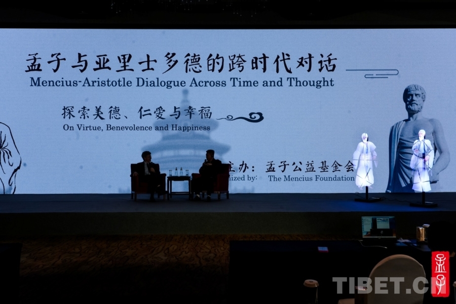 儀式上,以孟子與亞里士多德為人物形象的全息影像對話逐步展開。孟子公益基金會(huì)理事長孟亮與聯(lián)合國可持續(xù)發(fā)展解決方案網(wǎng)絡(luò)主席杰弗里?薩克斯作為對話人。此次對話聚焦孟子和亞里士多德對美德、仁愛的詮釋,以及兩者之間存在的共通性等。包括孟亮和薩克斯的對話環(huán)節(jié)、現(xiàn)場嘉賓的提問環(huán)節(jié)。全息影像形式新穎,現(xiàn)場問答氣氛活躍,實(shí)現(xiàn)了一場中西方文明跨越時(shí)間與空間的對話。(中國西藏網(wǎng) 記者/趙婧茹)