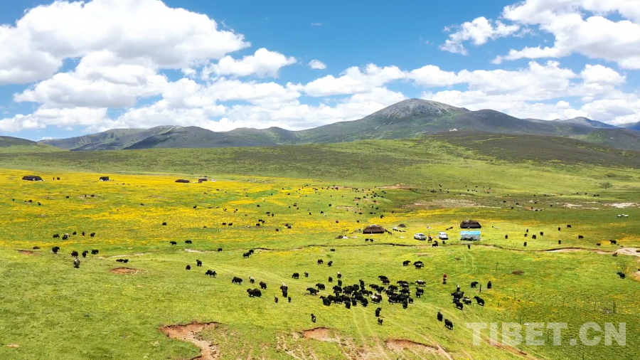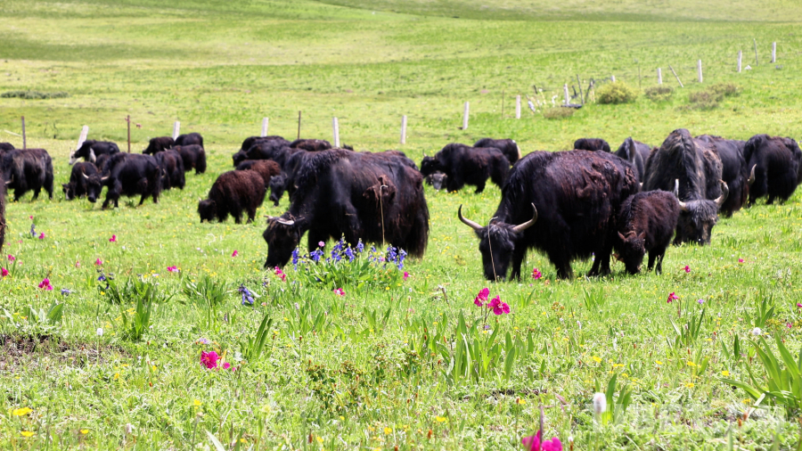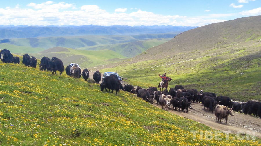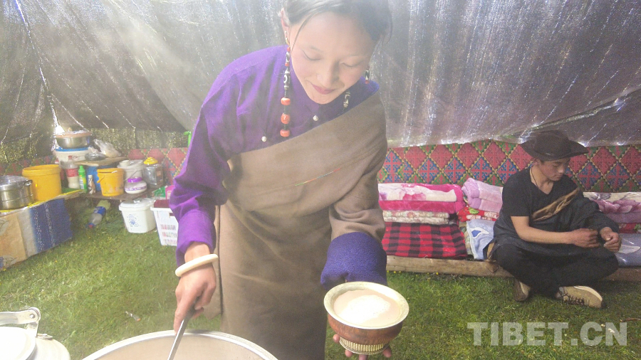 早晨天剛蒙蒙亮,他們就準(zhǔn)備出發(fā)了,一家人把生活必需品黑帳篷,火爐,鍋碗瓢盆,被褥及酥油糌粑等物資打包裝車,由家人先駕駛拖拉機把所有物資運送到夏季遠牧點,四郎彭措則和他的侄兒騎馬趕牛出發(fā)。冬季牧場到夏季牧場距離60公里,他們經(jīng)過9個小時的遷徙,終于在下午3點到達夏季牧場。此時他的家人也在鄰居的幫助下搭好了帳篷,煮好了酥油茶等待著他們。到了夏季牧場,牦牛們也迫不及待奔向了肥美的水草,四郎彭措和他的侄兒也終于可以卸下滿身的疲憊,品嘗家人們準(zhǔn)備好的美食。夏季牧場正是一年當(dāng)中最美的季節(jié),草原上開滿了五顏六色的花朵,多日不見的好友也帶著自己的家人早一步駐扎在此地,四郎彭措說道:“夏季放牧,轉(zhuǎn)場雖然辛苦,但也是一年中難得的閑暇時光。夏季水草肥美,牦牛們有充足的食物,來到夏季牧場放牧的牧民也有更多的活動時間,賽馬、唱歌、跳鍋莊舞是我最喜歡的活動?!?/p>