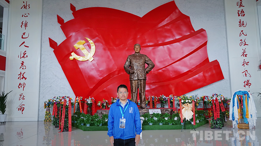 圖為青海省港區(qū)政協(xié)委員、本次研學(xué)團(tuán)副團(tuán)長王偉杰在尕布龍時(shí)代楷模紀(jì)念館。攝影:李泓慶