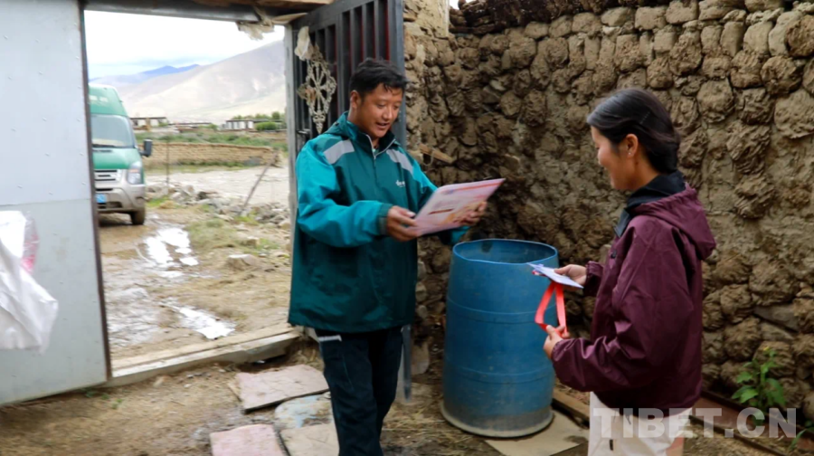 圖為郵政工作人員為次仁拉姆送來(lái)錄取通知書(shū)。
