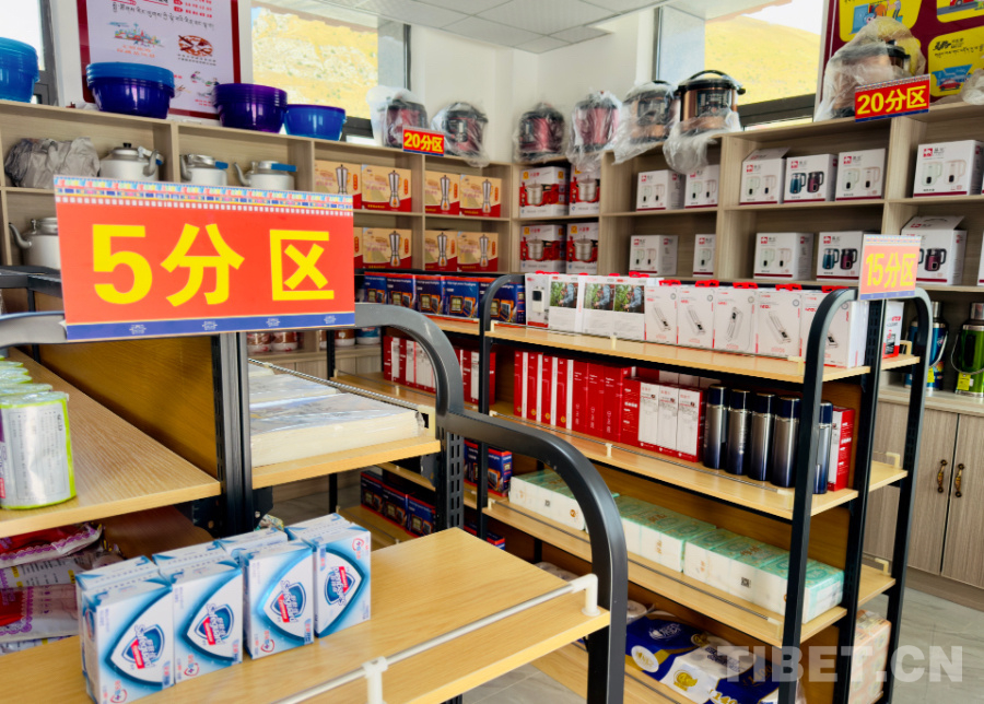 一進入積分兌換超市,貨架上琳瑯滿目的商品吸引了記者的目光,貨架主要分為5分區(qū)、10分區(qū)、15分區(qū)和20分區(qū)。在5分區(qū)可以兌換到作業(yè)本、香皂、濕巾,10分區(qū)可以兌換到家庭裝的洗潔精和洗衣粉以及電源插排,15分區(qū)可以兌換到移動電源、多功能探照燈、保溫杯和大包衛(wèi)生紙。想要兌換市場價上百元的電飯煲、高壓鍋、酥油打茶機也不是難事,只需要20積分,就可以輕松兌換。