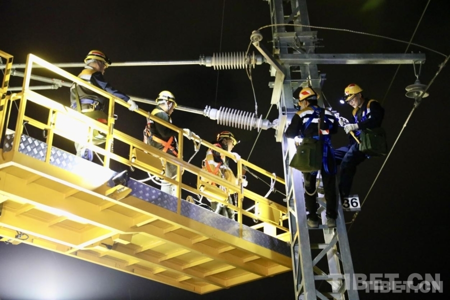 23時00分,軌道車穩(wěn)穩(wěn)???,“天窗”作業(yè)命令下達(dá)。中國鐵路青藏集團(tuán)有限公司拉薩基礎(chǔ)設(shè)施段供電維修技術(shù)中心拉薩南接觸網(wǎng)維修隊工長李積王帶著7名工友走下接觸網(wǎng)作業(yè)車,驗電、連接地線端、接掛地線……一系列操作一氣呵成。隨即,現(xiàn)場負(fù)責(zé)人拉加和工友們依次登上距離地面6米高的作業(yè)平臺上,穿梭于接觸網(wǎng)線索之間,猶如凌空“舞者”。