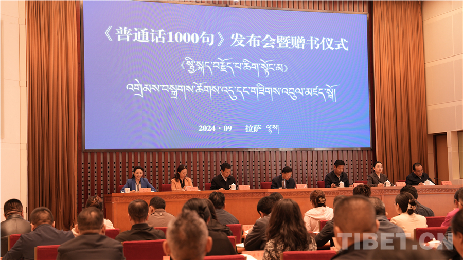 中國(guó)西藏網(wǎng)訊 為進(jìn)一步助力國(guó)家通用語(yǔ)言文字推廣普及,鑄牢中華民族共同體意識(shí)。9月20日,西藏自治區(qū)藏語(yǔ)委辦(編譯局)在拉薩舉行了《普通話(huà)1000句》漢藏對(duì)照版新書(shū)發(fā)布會(huì)暨贈(zèng)書(shū)儀式。西藏自治區(qū)政府副主席、自治區(qū)藏語(yǔ)委副主任甲熱·洛桑丹增出席會(huì)議,西藏自治區(qū)藏語(yǔ)委辦(編譯局)黨組副書(shū)記、主任(局長(zhǎng))達(dá)娃次仁作新書(shū)出版介紹,會(huì)上宣讀了教育部語(yǔ)文出版社發(fā)來(lái)的賀信,并向與會(huì)代表贈(zèng)書(shū)。