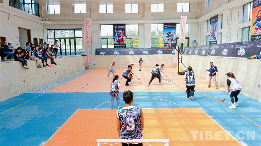 圖為參賽選手們進(jìn)行旱地冰球比賽