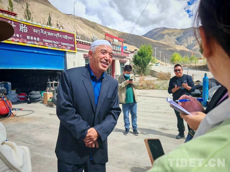 圖為馬彬林在汽修店前接受采訪 攝影:西藏自治區(qū)網(wǎng)信辦格桑
