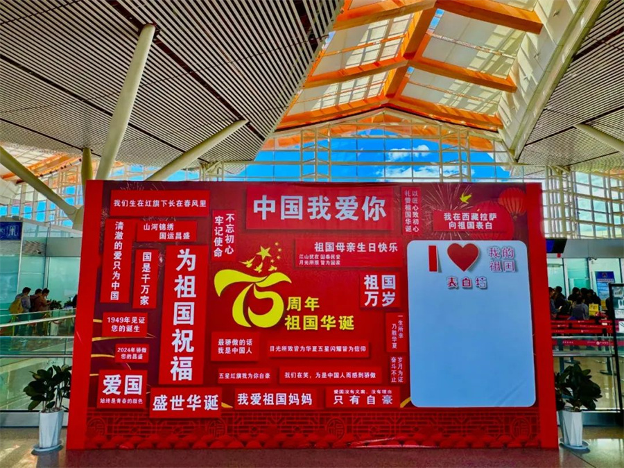 圖為拉薩貢嘎國際機場T3航站樓內(nèi)設(shè)置的愛國表白墻