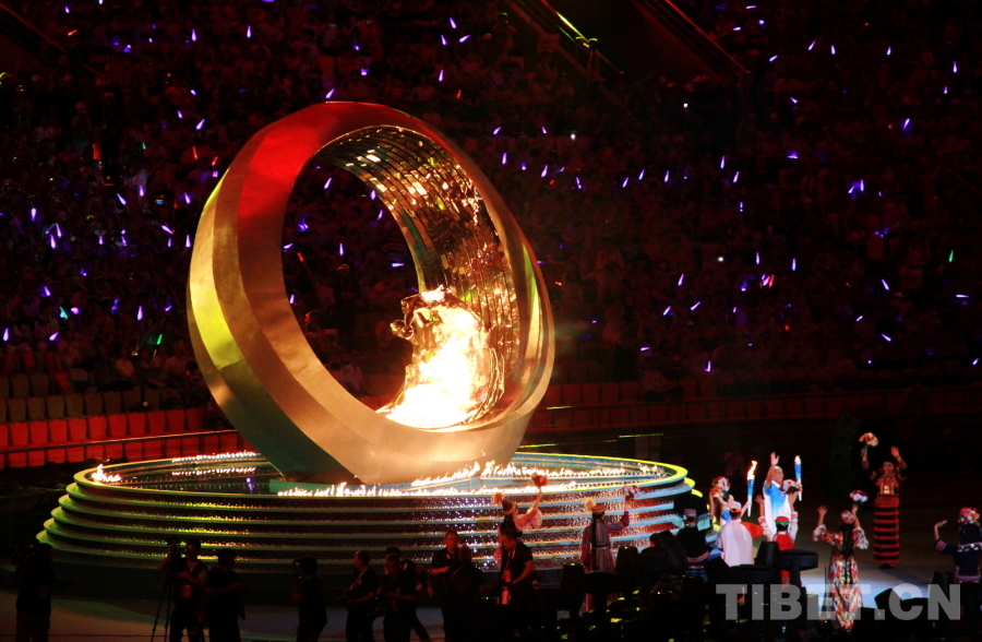 圖為第十二屆全國少數(shù)民族傳統(tǒng)體育運動會主火炬點燃 攝影:劉莉