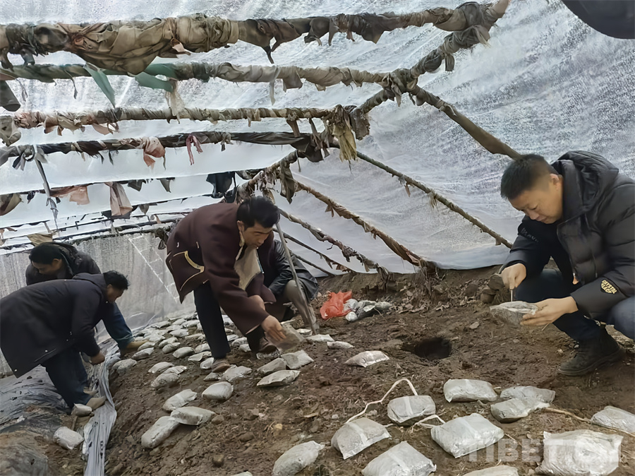 圖為昌都市農(nóng)業(yè)科學(xué)研究所工作人員為羊肚菌擺放外源營養(yǎng)袋,為菌絲生長補充營養(yǎng)
