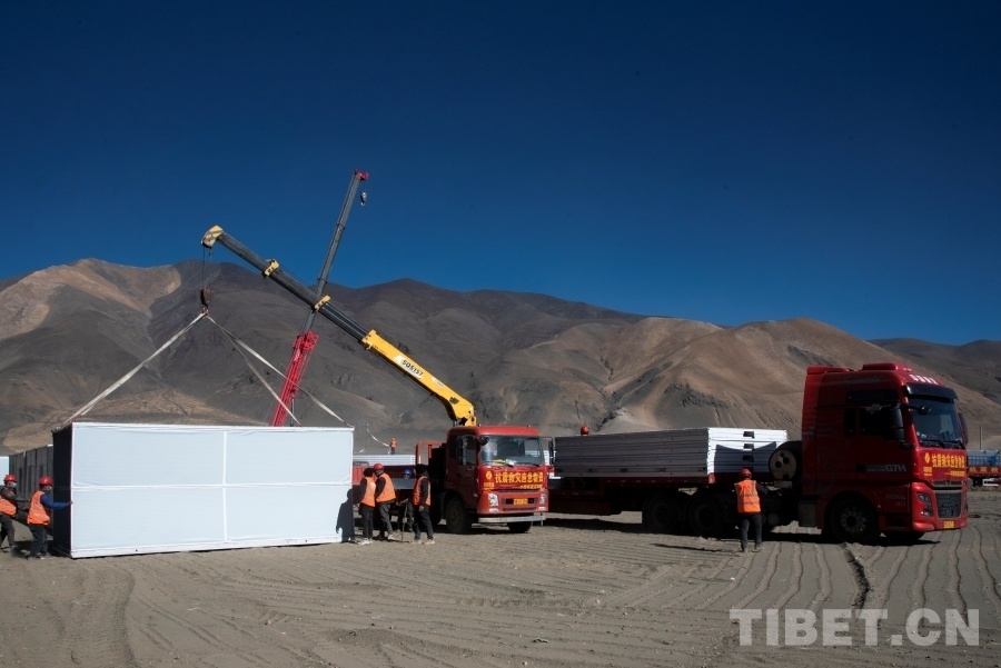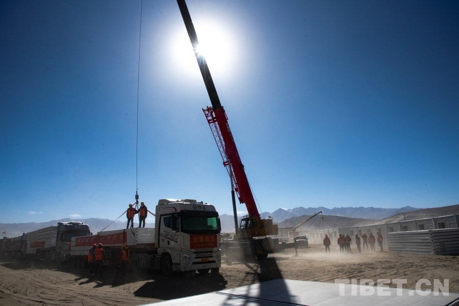 圖為工作人員正在日喀則市定日縣長所鄉(xiāng)森嘎村內抓緊搭建活動板房 攝影:趙振宇