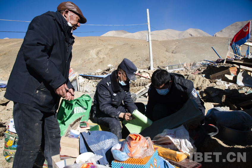 在坍塌房屋面前,救援隊伍排成一列,小心翼翼地傳遞著從受災群眾家里轉移出來的財產。一包牛肉干、一袋青稞面、一只老木箱,無論物資體積大小,救援人員都把它們當作自己家的東西一樣珍惜,在受災群眾確認后由公安干警在現(xiàn)場登記并返還給受災群眾。