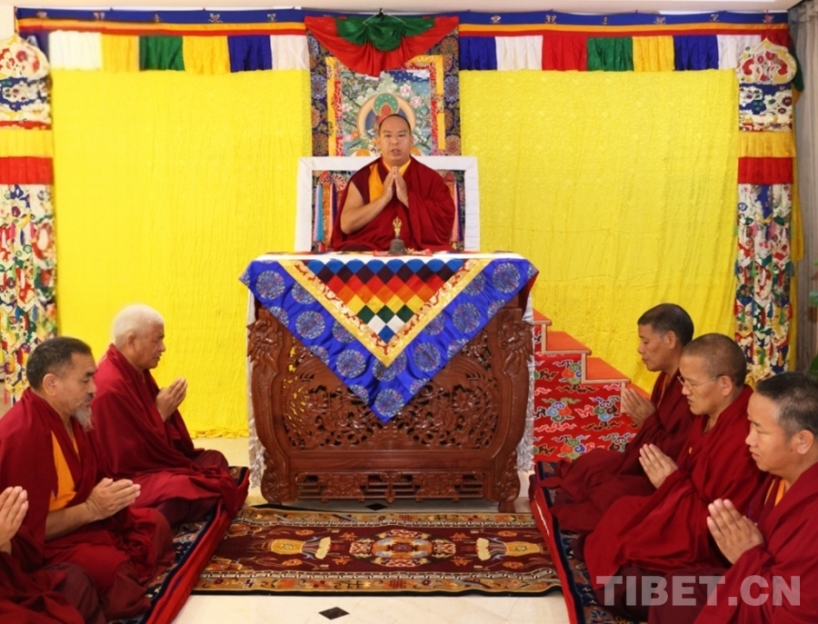 圖為班禪額爾德尼·確吉杰布與眾僧為定日地震災區(qū)誦經(jīng)祈福
