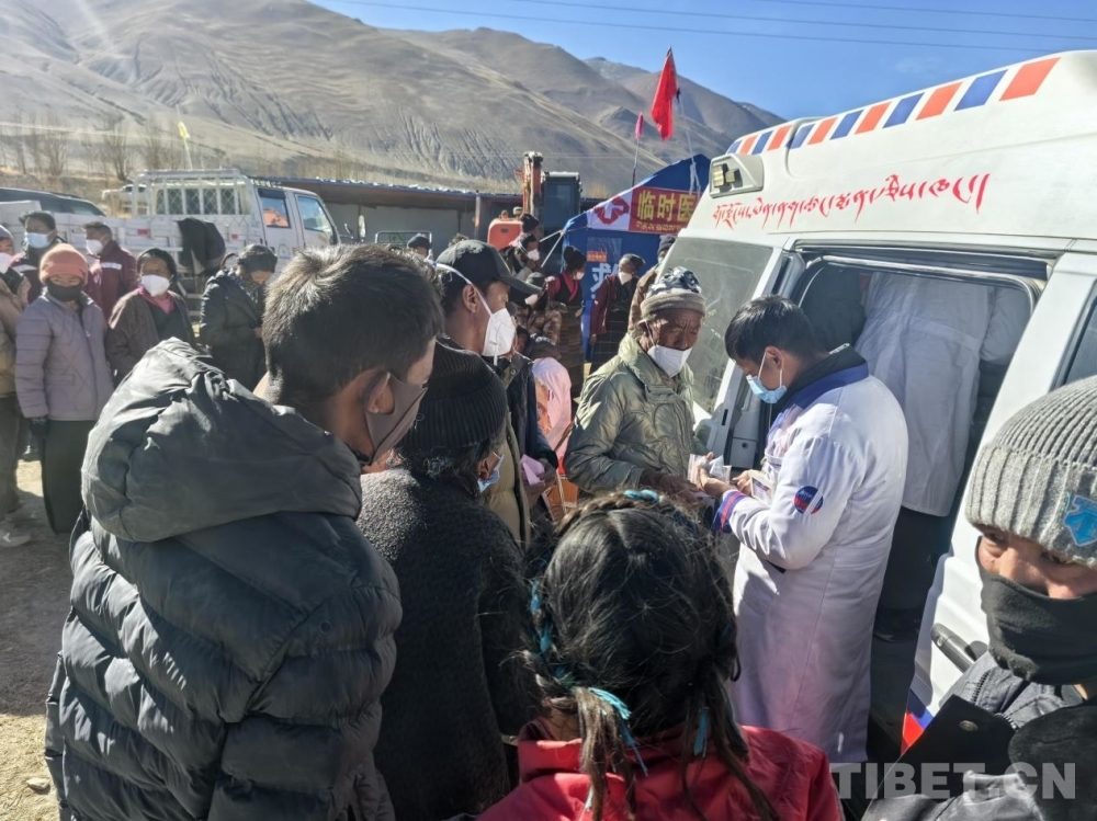 圖為日喀則邊那倉(cāng)藏醫(yī)院醫(yī)護(hù)人員為災(zāi)區(qū)群眾巡診問(wèn)診