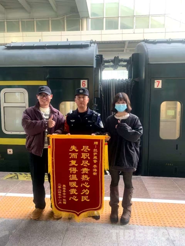 圖為旅客為李警長送錦旗。2024年11月,李警長在列車巡檢時發(fā)現(xiàn)一部被旅客遺失的手機,在與失主取得聯(lián)系后將手機送還。 受訪者供圖