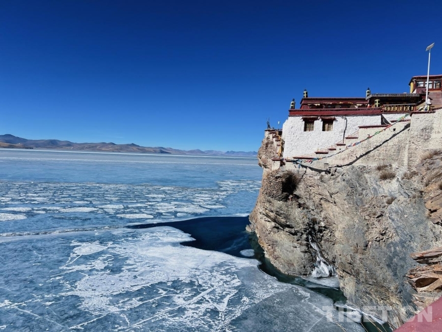 圖為普莫雍錯一角化冰,湖面清澈見底,如同一塊翡翠掉落在推瓦寺一旁,美麗動人。攝影:德吉卓瑪