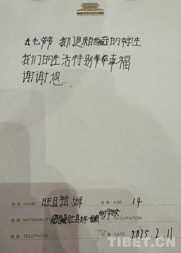 2025年2月11日,西藏阿里地區(qū)邊境縣初中學(xué)生瞻仰毛主席紀(jì)念堂后的留言 攝影:張?jiān)テ?/p>