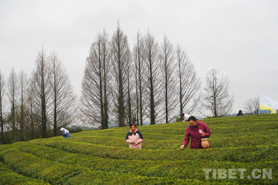 圖為羅布央宗和明珠措姆在采茶