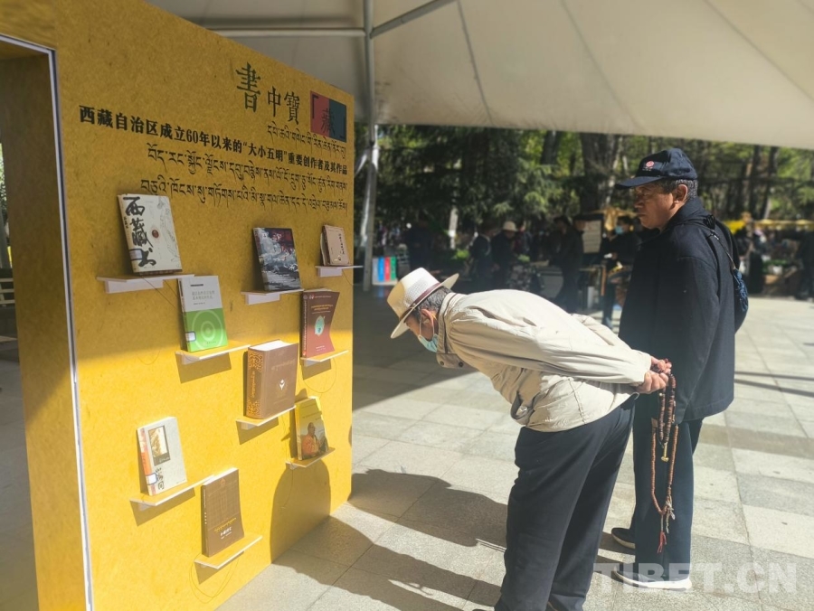 圖為4月19日,第二屆“拉薩春日書會”主會場宗角祿康公園內(nèi),市民駐足觀看書籍作品陳列 攝影:趙釗