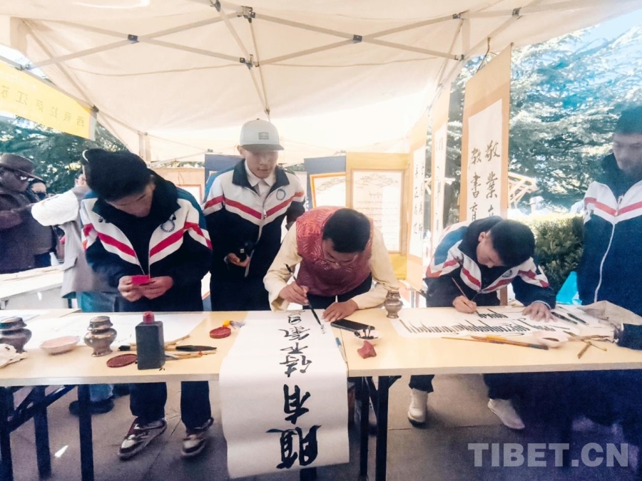 圖為4月19日,第二屆“拉薩春日書會”宗角祿康公園主會場內(nèi),拉薩江蘇實(shí)驗(yàn)中學(xué)書法社的同學(xué)們在撰寫書法作品 攝影:趙釗