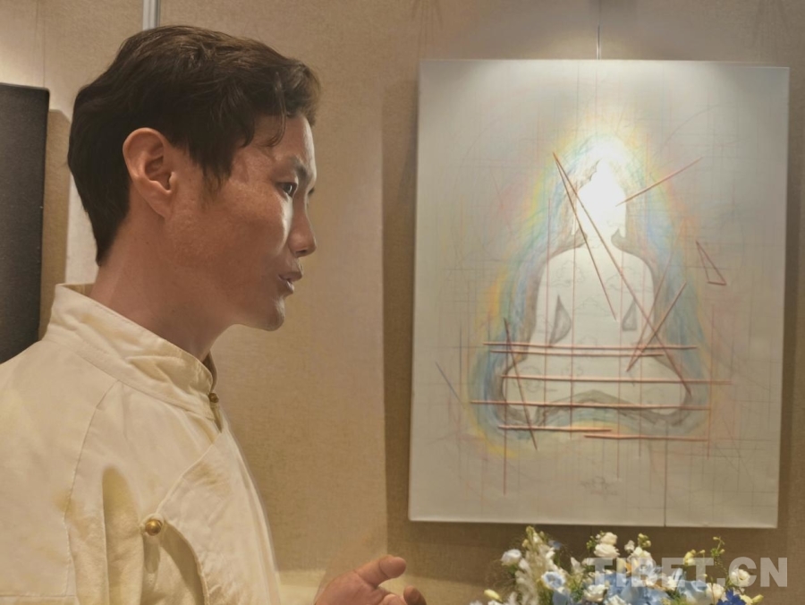 圖為5月2日至8日舉行的“三國同框 四季如畫 五彩亞東——亞東縣文化交流及特色產品展銷活動”上,亞東青年藝術家索喃次仁在介紹他的作品 攝影:趙釗