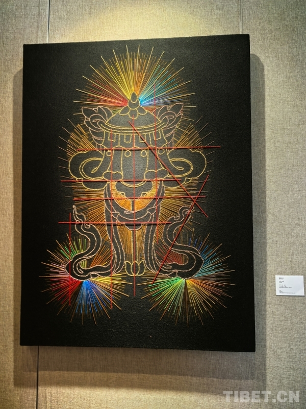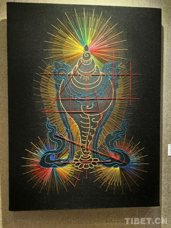 索喃次仁的作品慣以手工羊絨布為面,彩色羊毛線為語言,呈現(xiàn)標志性的“彩虹”元素?!埃ㄎ鞑兀﹤鹘y(tǒng)的藝術是有一定標準的,而當代藝術是可以無界的,包括材質、材料都可以有所創(chuàng)新,是表達個人情感和生活的一種藝術形式。我常常問自己,能不能突破傳統(tǒng)?可不可以做一些比較新的東西?像我現(xiàn)在創(chuàng)作選擇用羊絨布,就是我的一種情感表達,因為(它)與我的家鄉(xiāng)有深切關系?!彼鬣稳式忉尩?/span>:“比如說這一幅作品,佛像外呈現(xiàn)出一種彩虹的狀態(tài)。因為彩虹本身是一個無常的現(xiàn)象,而我之前學過唐卡佛像,所以把佛像和彩虹理念結合了,這既是一種傳承,也是突破?!?/span>