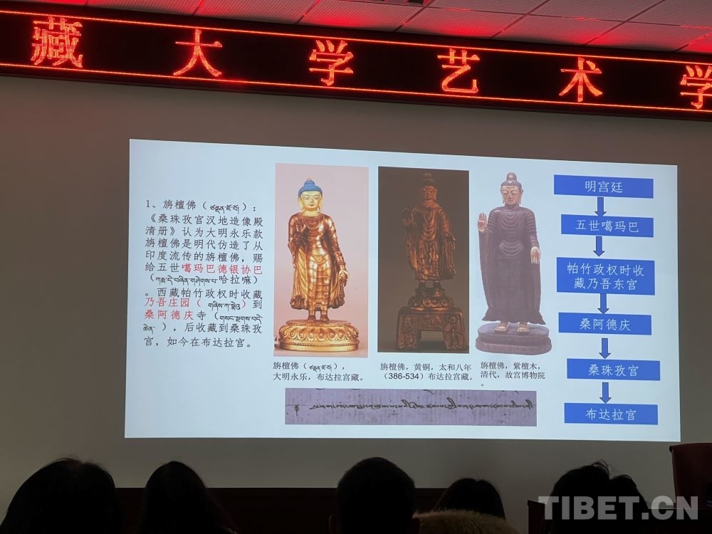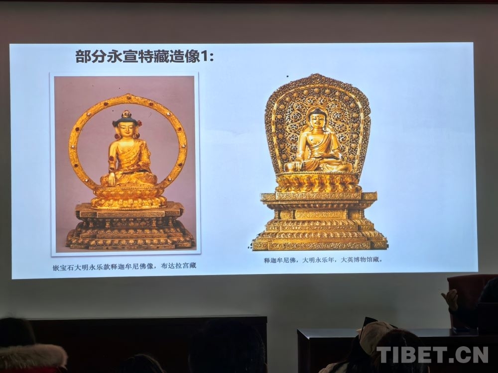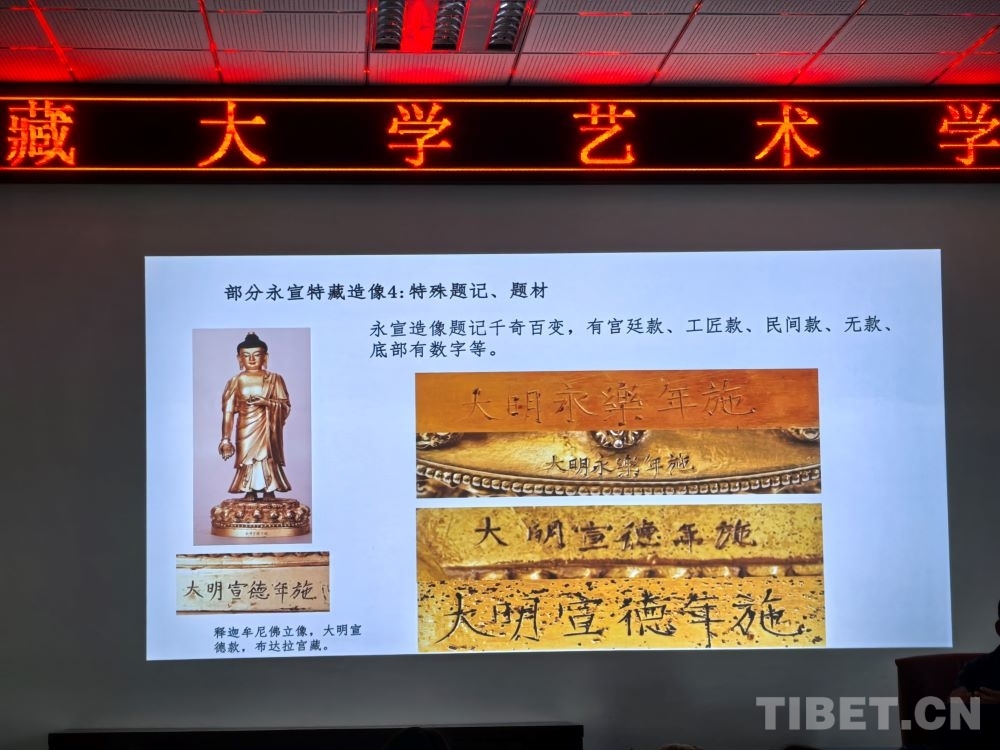 5月8日,在西藏大學(xué)藝術(shù)學(xué)院內(nèi),一場(chǎng)題為《布達(dá)拉宮館藏大明永宣款造像相關(guān)問(wèn)題考察——兼談“漢地造像殿”的復(fù)原陳設(shè)研究》的講座吸引了眾多學(xué)術(shù)愛(ài)好者。布達(dá)拉宮文物管理處文物研究室班旦次仁老師以大量西藏大明永宣款造像為案例,向在場(chǎng)聽(tīng)眾介紹了這一時(shí)期的佛像如何以媒介的形式增強(qiáng)各民族間的感情。