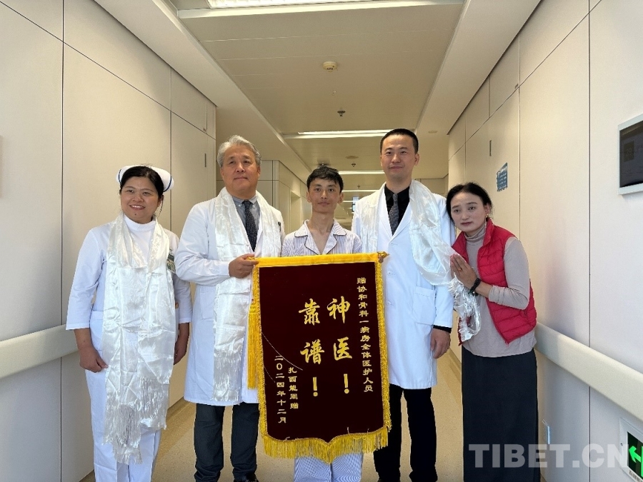 圖為受到救助的藏族患者向北京協(xié)和醫(yī)院骨科醫(yī)療團(tuán)隊(duì)贈(zèng)送錦旗 攝影:楊眉笑