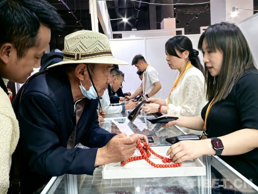 圖為5月16日第二屆拉薩進口商品展覽會上,顧客在咨詢珊瑚飾品價格 攝影:王淑