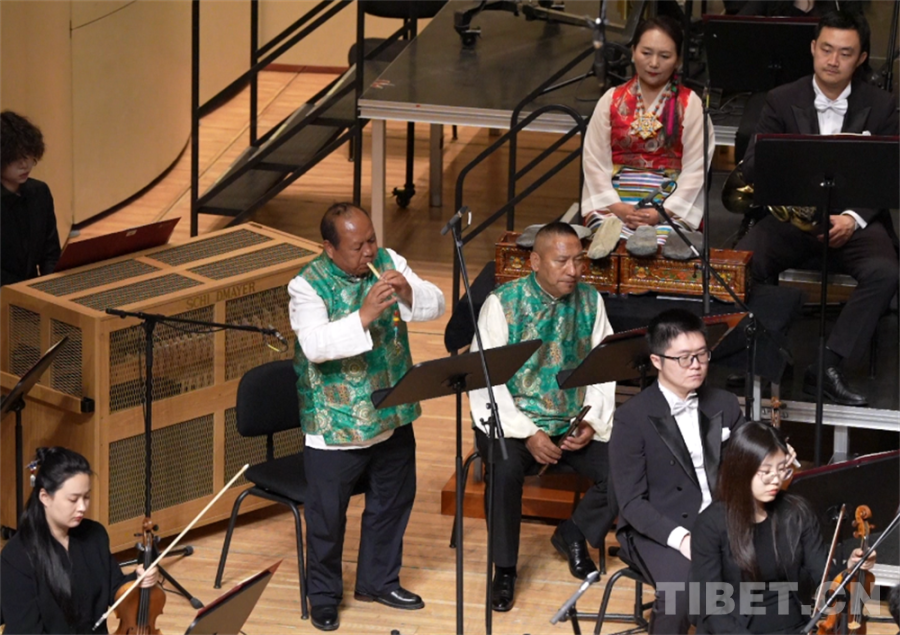 西藏傳統(tǒng)器樂同交響樂配合得相得益彰,讓聽眾們無不為之深深折服。西藏大號(hào)(藏語稱“銅欽”)低沉渾厚,展現(xiàn)了歷史的波瀾壯闊;扎木念琴聲輕快明朗,牛角胡(藏語稱“嗶旺”)婉轉(zhuǎn)悠揚(yáng),堆諧、弦子等傳統(tǒng)民間音樂特色鮮明,展現(xiàn)了中華優(yōu)秀傳統(tǒng)文化的豐富多彩;鷹笛(藏語稱“歸鈴”)高亢悠揚(yáng),西藏豎笛(藏語稱“雄林”)婉轉(zhuǎn)嘹亮,描繪了人與自然和諧共生的美麗畫卷。在樂曲創(chuàng)作中,還首次將石琴(藏語稱“奪丁”)、熱瑪琴與交響樂融合,既豐富了樂曲的表現(xiàn)力,也促進(jìn)了傳統(tǒng)民族器樂的創(chuàng)新發(fā)展。