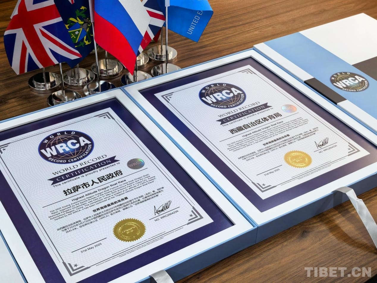 世界紀(jì)錄認(rèn)證機(jī)構(gòu)(WRCA)認(rèn)證官馬克先生發(fā)來賀電;WRCA中國區(qū)認(rèn)證官王靜女士現(xiàn)場宣布了世界紀(jì)錄認(rèn)證結(jié)果;WRCA中國區(qū)負(fù)責(zé)人、世界紀(jì)錄申報中心主任趙青太為西藏自治區(qū)體育局、拉薩市人民政府頒發(fā)了“世界海拔最高的龍舟賽”世界紀(jì)錄認(rèn)證書。