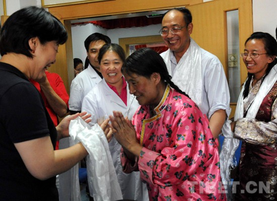 圖為術(shù)后的斯求卓瑪在北京藏醫(yī)院向幫助她治病的北京安貞醫(yī)院醫(yī)生顧虹(左一)和時(shí)任新華社記者唐召明(右二)等人敬獻(xiàn)哈達(dá)(王普2010年5月20日攝)