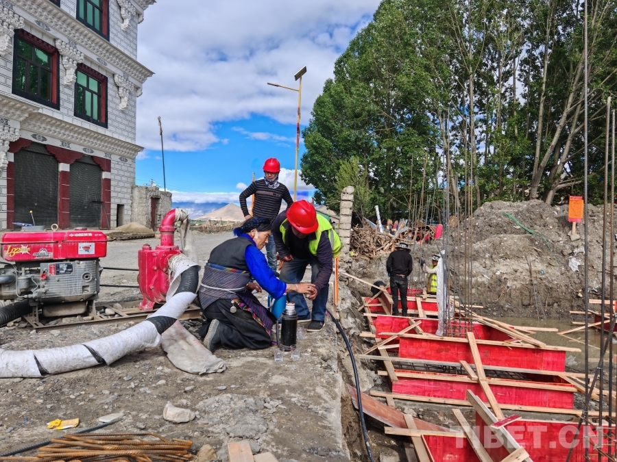 在仲康村巴桑家的重建工地上,工程已進入鋼筋捆扎階段。一場突如其來的夜雨導致基坑積水。清晨七八點,施工隊員已在基坑中忙碌開來,有的加緊捆扎鋼筋,有的尋找水泵抽水。日頭漸高,汗水浸濕了工人們的額頭,他們卻無暇休息。這時,阿媽巴桑提著一壺剛煮好的甜茶走來,就地一杯杯沏好,熱情地招呼這群“小伙子”?!耙郧暗睦戏孔诱饓牧耍F(xiàn)在黨和政府給我們建更好的新房子,日子肯定越過越有盼頭!”樸實的話語里,滿是她對未來的憧憬和對援助的感激。