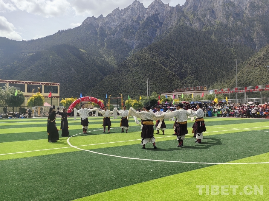 圖為西藏洛隆縣達(dá)龍鄉(xiāng)第二屆中遠(yuǎn)海運(yùn)鄉(xiāng)村足球聯(lián)賽“吉祥杯”開(kāi)幕式上的舞蹈表演