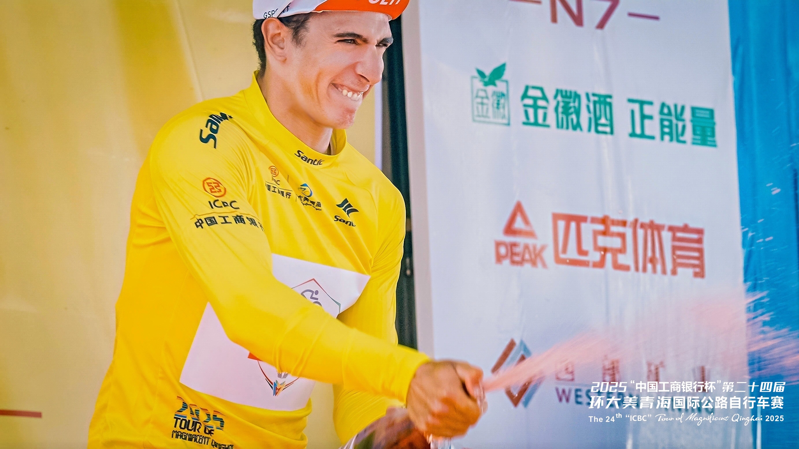 圖為本屆環(huán)青賽第一賽段結(jié)束后“黃衫”獲得者。