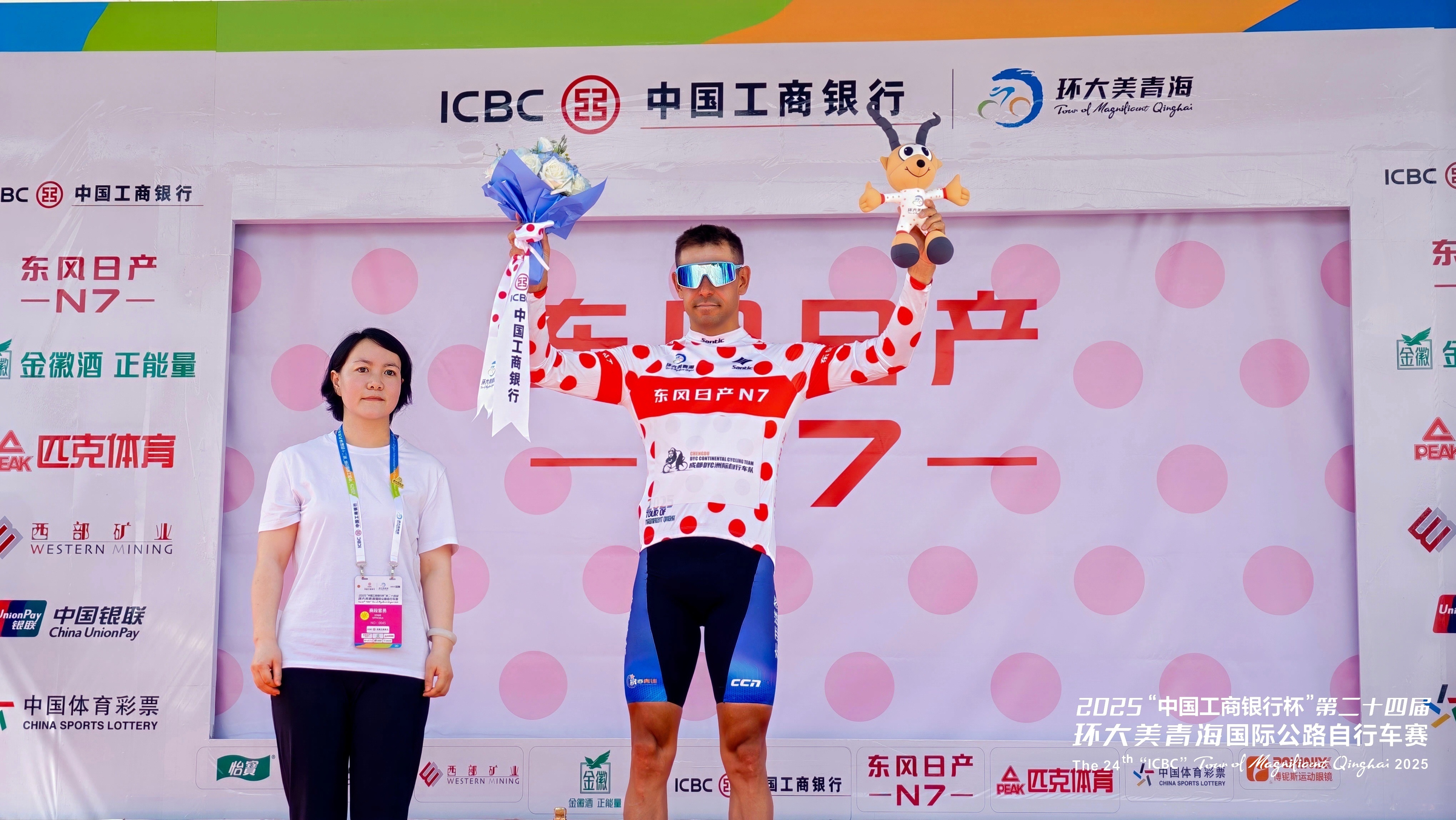 圖為本屆環(huán)青賽第一賽段結(jié)束后“圓點衫”獲得者,也被人們形象地稱為“爬坡王”。