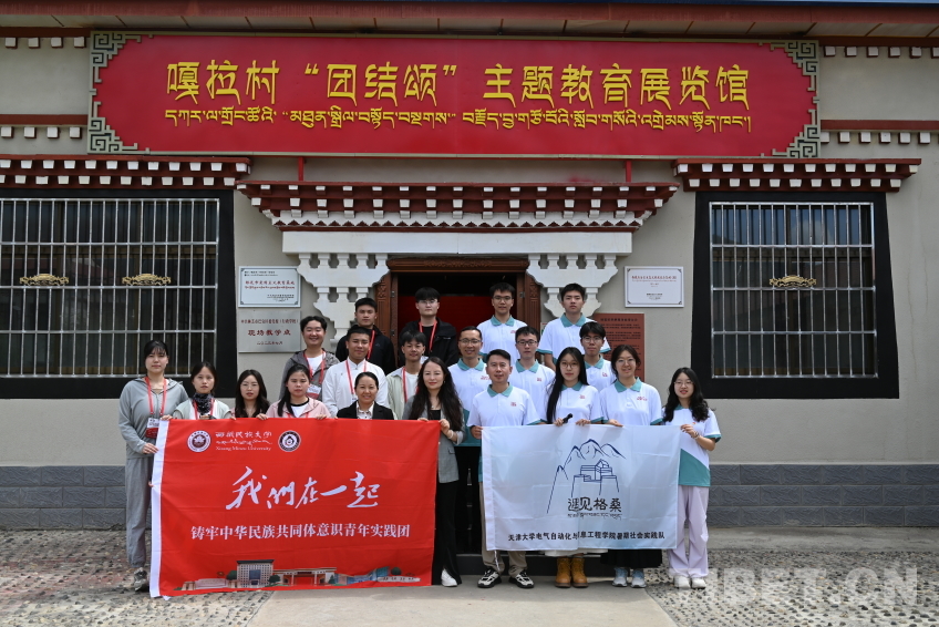 圖為西藏民族大學實踐團在嘎拉村“團結頌”主題教育展覽館前的合影
