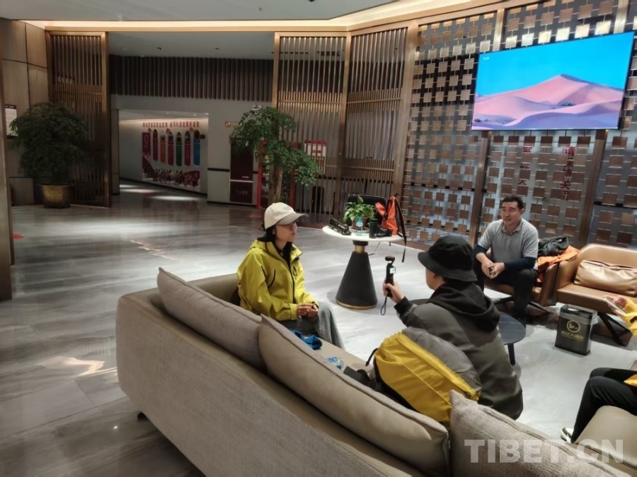 圖為中國(guó)西藏網(wǎng)“和美那曲”報(bào)道組采訪廣東自駕游客 攝影:王東