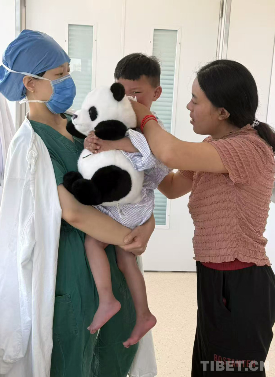 圖為北京口腔醫(yī)院醫(yī)護(hù)人員抱著斯曲卓瑪與母親強(qiáng)措臨時(shí)告別,準(zhǔn)備到手術(shù)室進(jìn)行下唇血管瘤的藥物注射治療(吉色2025年6月6日攝)