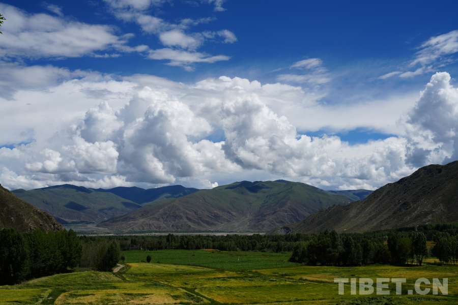 中國西藏網(wǎng)訊 站在觀景臺遠(yuǎn)眺,綠樹成蔭,一陣風(fēng)吹過,麥浪金黃;漫步色甫林卡,帳篷搭建得整整齊齊,牛羊悠閑地曬太陽;走進(jìn)望果賽馬場,當(dāng)?shù)厝罕娨言缭缵s來搭建帳篷,各家各戶其樂融融。