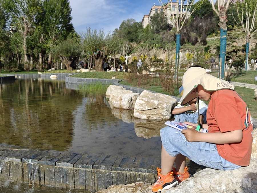 圖為孩子在公園內(nèi)閱讀書籍