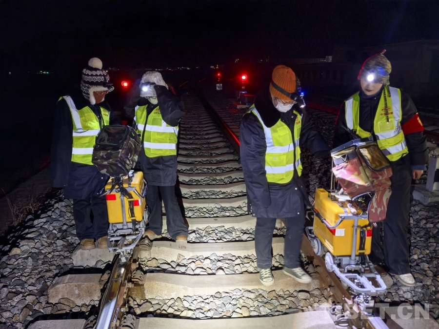 圖為扎西旺姆(右一)與女子探傷班成員們執(zhí)行夜間鋼軌探傷作業(yè)