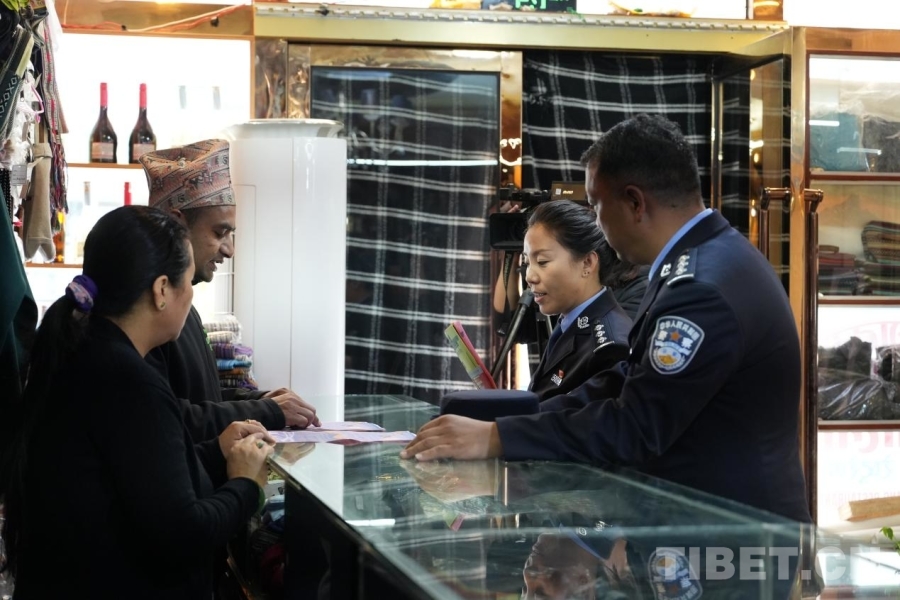 圖為吉隆鎮(zhèn),在尼籍網(wǎng)格聯(lián)絡(luò)員嘎杰姆·斯里斯特(左一)的門店,吉隆口岸公安分局出入境管理大隊民警羅珍(右二)正進行日常走訪宣講 攝影:邊子捷