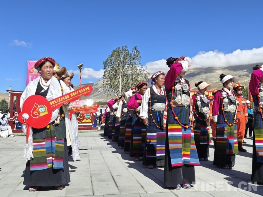 圖為儀式現(xiàn)場,身著定日傳統(tǒng)服飾的村民正在合影留念