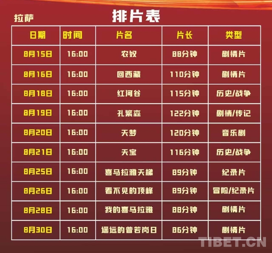 圖為“慶祝西藏自治區(qū)成立60周年”主題影展排片表