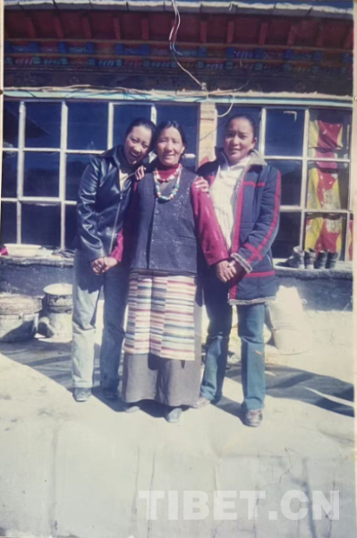 這是在我們家老房子門口照的。那時(shí)候全是土坯房,這間是四間房里最大的。大概是1990年左右。記得穿的這身衣服那些年很多人都穿,應(yīng)該是軍裝,穿著這衣服騎馬去挖藥很多次。人民公社時(shí)期我們有八個(gè)生產(chǎn)隊(duì),那時(shí)候要采藥掙工分,偶爾拉薩藏醫(yī)院的老師們會(huì)專程來札達(dá),我們也要幫忙去采藥。這邊藥材很多,如雪蓮花、黃連、蒂丁等。拍這張照片時(shí)孩子的鞋和幾件衣服是我自己織的,但要買好衣服還得去阿里地區(qū)。那時(shí)我丈夫已經(jīng)在開車,我們家條件稍好些,但也不是村里最好的。