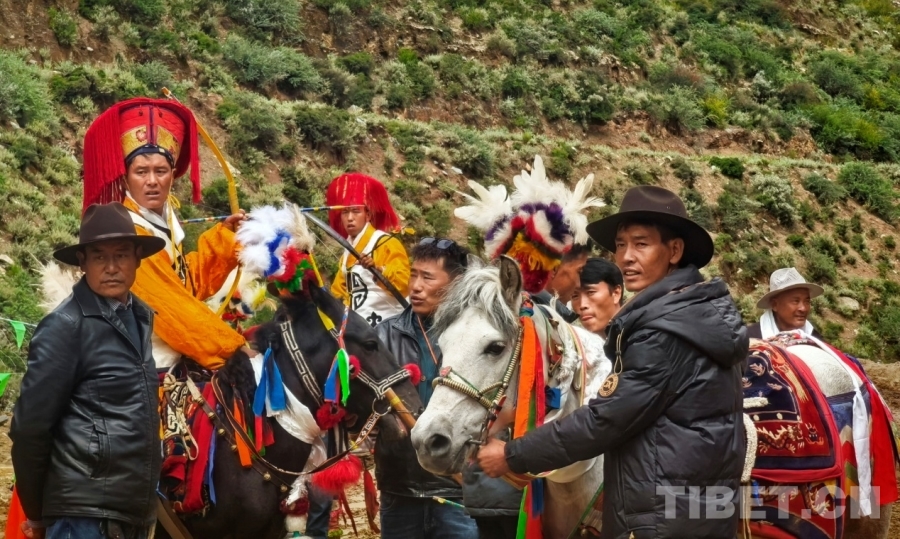 圖為西藏自治區(qū)山南市貢嘎縣昌果鄉(xiāng)普夏村望果節(jié)賽馬會現(xiàn)場,年長村民正在指導(dǎo)年青騎手射箭要領(lǐng) 攝影:劉莉