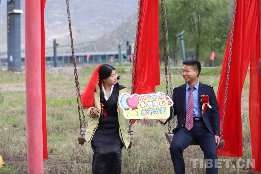 在全場(chǎng)來(lái)賓的祝福中,兩對(duì)身穿鐵路制服和民族服飾的新人成為本次集體婚禮的耀眼主角,在現(xiàn)場(chǎng)同事的見(jiàn)證下,在拉薩地區(qū)特有的藏戲祝福聲中,完成了一場(chǎng)終生難忘的儀式。新人王克龍與武春燕并肩坐在秋千上,目光緊緊相依;愛(ài)情長(zhǎng)廊中,另一對(duì)新人張慶強(qiáng)與蔡雨欣共同掛上同心鎖。
