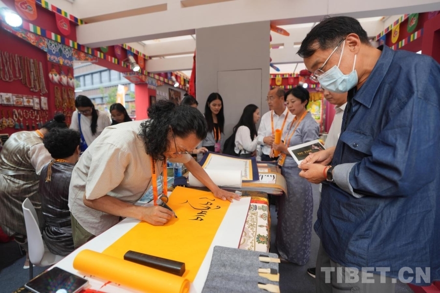 圖為藏文書法老師在現(xiàn)場為參觀人員書寫祝福語