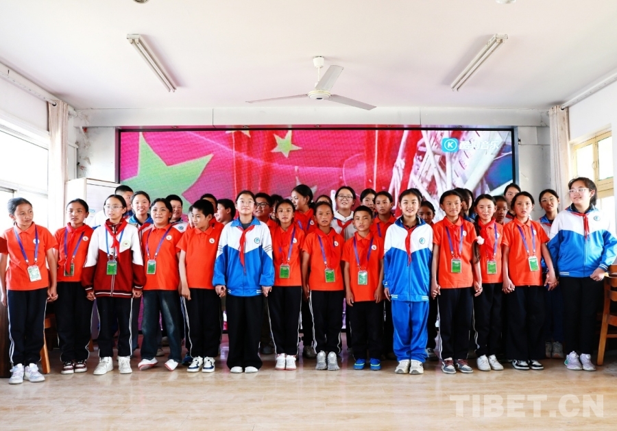 圖為西藏阿里噶爾縣孔繁森小學(xué)和山東聊城堂邑鎮(zhèn)中心小學(xué)的孩子們合唱中國(guó)少年先鋒隊(duì)隊(duì)歌《我們是共產(chǎn)主義接班人》 攝影:劉莉
