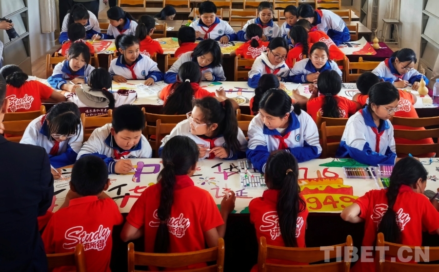 圖為西藏、山東小朋友共同繪制迎國(guó)慶主題長(zhǎng)卷 攝影:劉莉