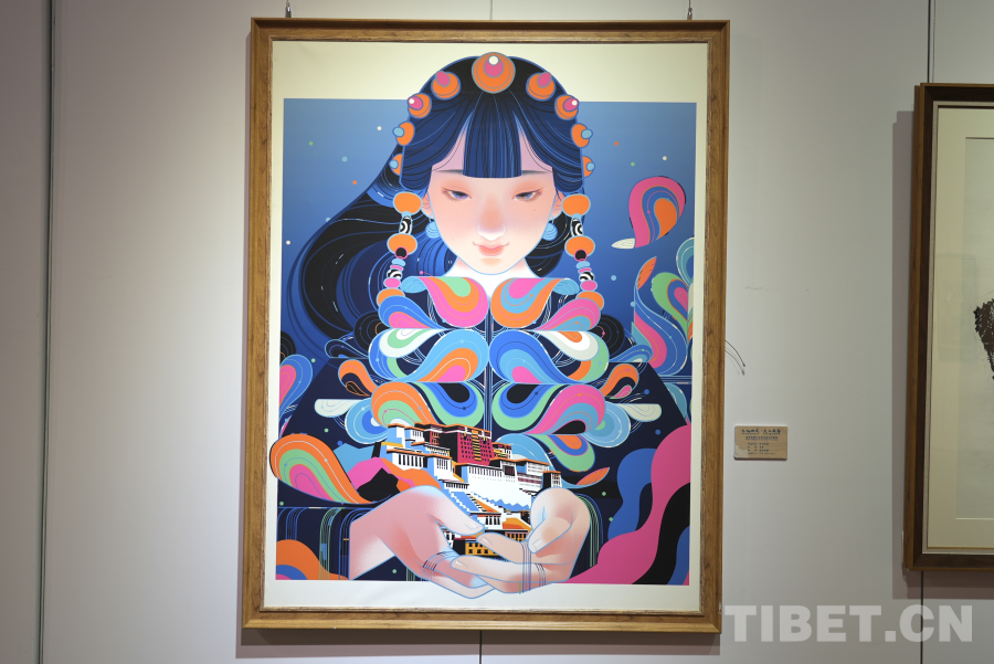 展覽現(xiàn)場,參展藝術(shù)家李旻的作品《虹光圣城》色彩絢麗,構(gòu)思新穎,引得眾多觀眾駐足觀看。據(jù)介紹,本幅作品是一副綜合運用了現(xiàn)代藝術(shù)創(chuàng)作手段的數(shù)字繪畫,同時融入了如布達拉宮、藏裝等經(jīng)典的藏式元素,畫面生動,色彩鮮艷,形式新穎,展現(xiàn)了當代西藏藝術(shù)的傳承與創(chuàng)新,是本次展覽極具代表性的作品之一。